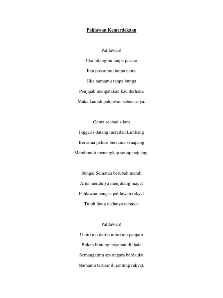 Tanahair dan bangsa di mana terpaut cinta mulia. Maksud Lambang dan Warna Pada Bendera Malaysia PAHLAWAN KEMERDEKAAN kepada pahlawan Pahang Pahlawan. Seingat saya saat itu ada sekitar 10 puisi yang harus dikuasai antara lain.